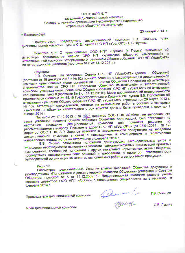 Протокол дисциплинарной комиссии №7 - 2014