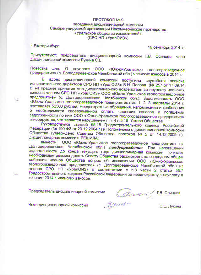 Протокол дисциплинарной комиссии №9 - 2014