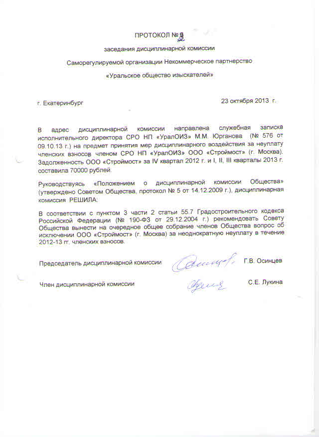 Протокол дисциплинарной комиссии № 2 - 2013