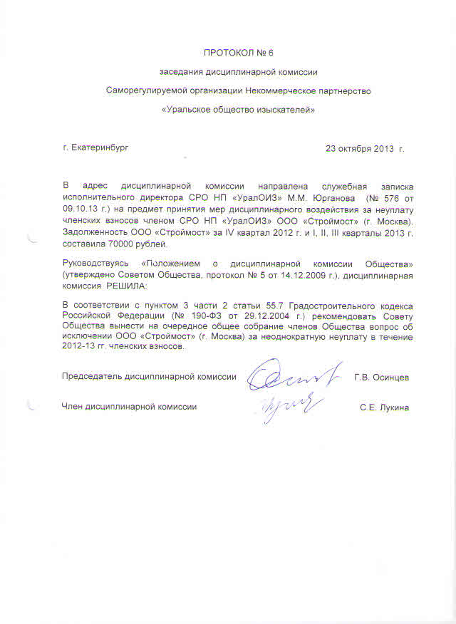 Протокол дисциплинарной комиссии № 6 - 2013